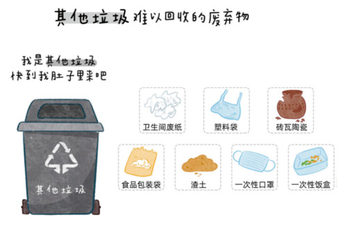 其他垃圾:指除有害垃圾、可回收物、厨余垃圾以外的其他生活废弃物,大多数家用卫生品以及复合型的。由多种材质、部件组成却难以拆解的产品,比如打火机、笔、伞等。
