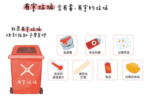 有害垃圾:会对人体健康或自然环境造成直接或潜在危害,分类投放后将交由专业的处置单位进行无害化处理。日常生活中常见的有害垃圾并不多,记住口诀:“汞灯药(汞、灯、药)池漆(池、漆)”。