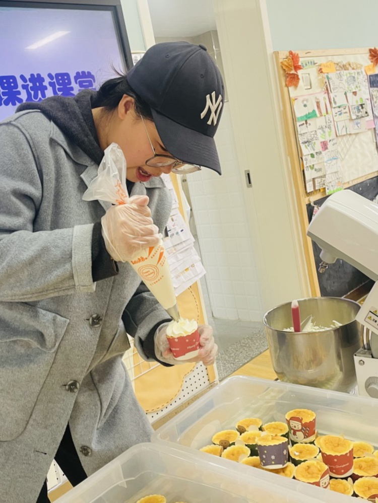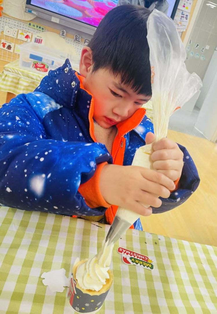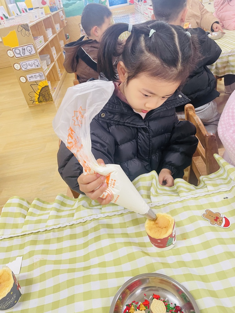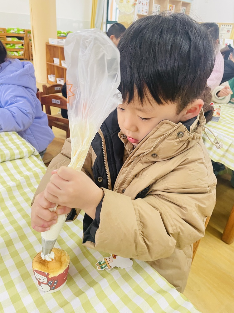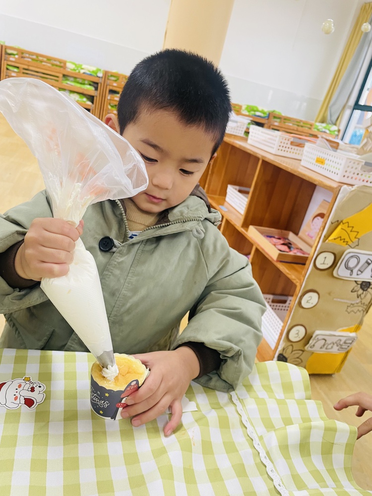 原来是做纸杯蛋糕裱花,助教家长正在向小朋友们介绍制作过程和工具呢!“这是裱花袋,这是蛋糕糖......”