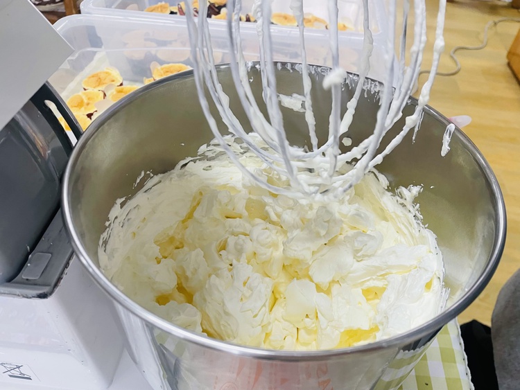 首先,把淡奶油和细砂糖按比例放入电动打蛋器里,打发至可以裱花的状态。