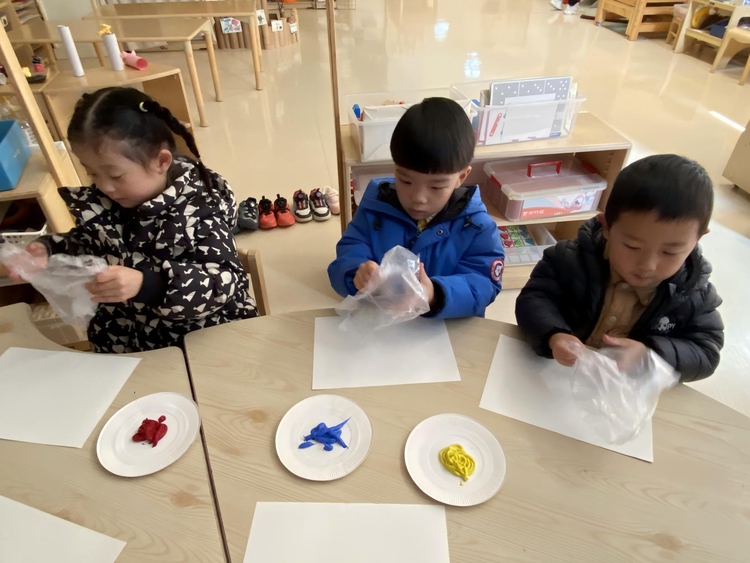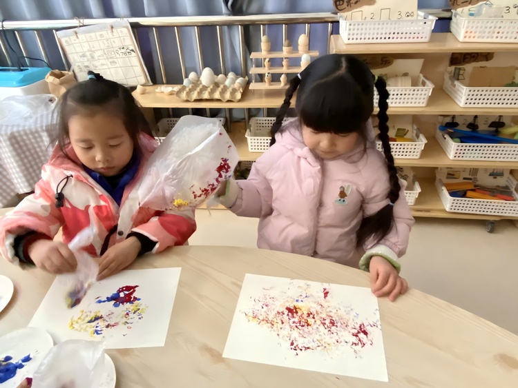 除了利用塑料袋进行各种有趣的户外游戏,宝贝们还巧妙地将塑料袋与水粉颜料结合起来,创造出了一副精美的画作。这种“变废为宝”的魔力,让孩子们认识到保护环境的紧迫性。