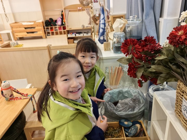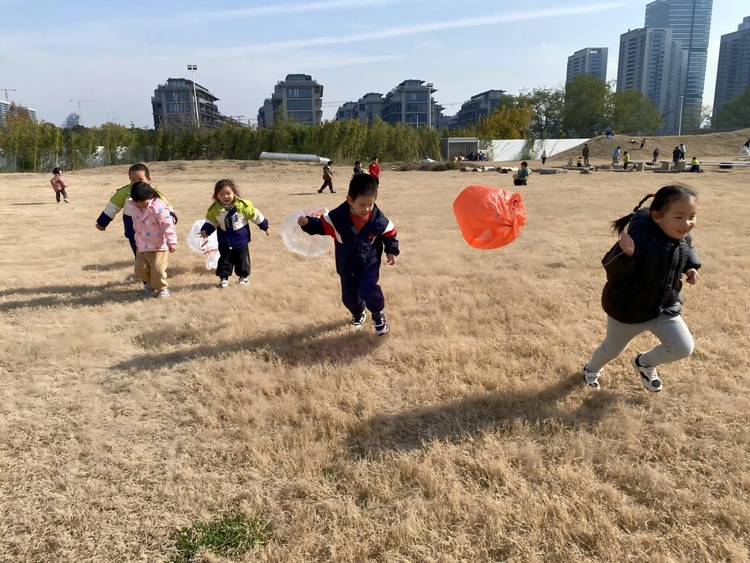 探索完塑料袋的秘密后,孩子们发现原来毫不起眼的塑料袋还有很多好玩的地方!看,孩子们利用塑料袋轻盈的特点,在辰星自然场里开展“放风筝”的游戏呢!