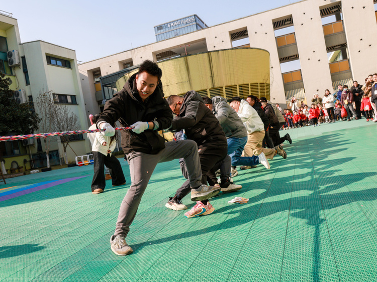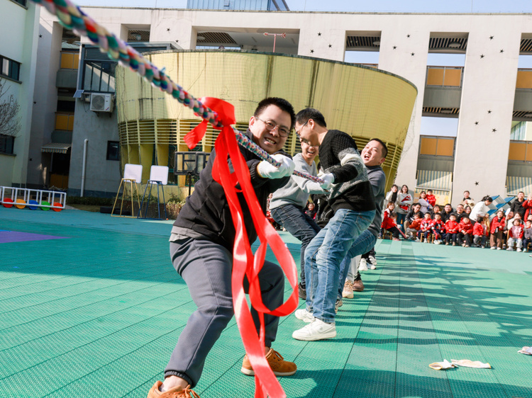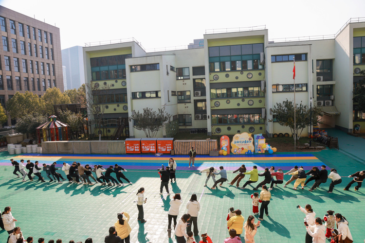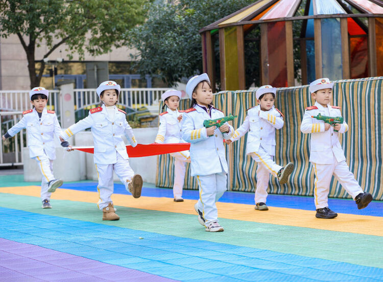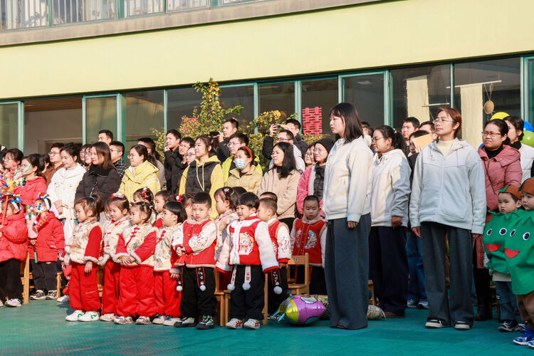 迎着朝阳,主持人宣布余杭区苕溪幼儿园田园运动节正式开幕,伴随着国旗护卫队的坚定步伐,全体幼儿与家长起立,向国旗行注目礼。