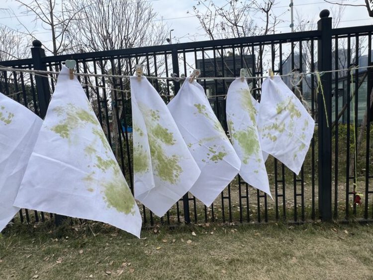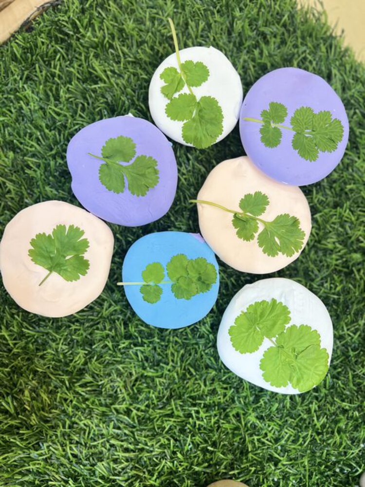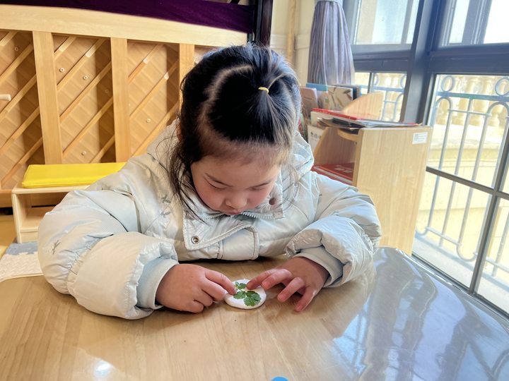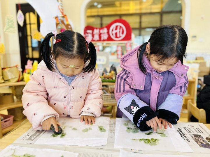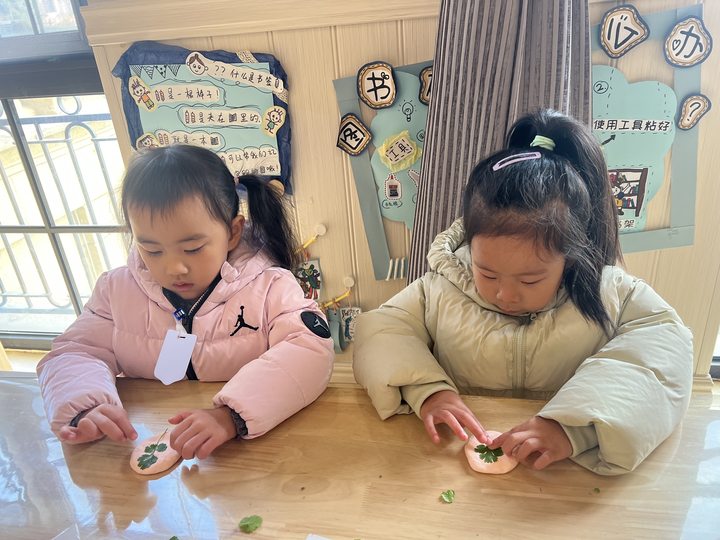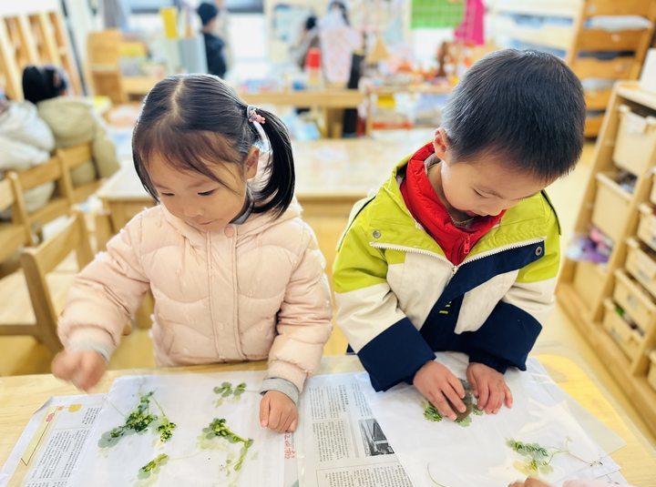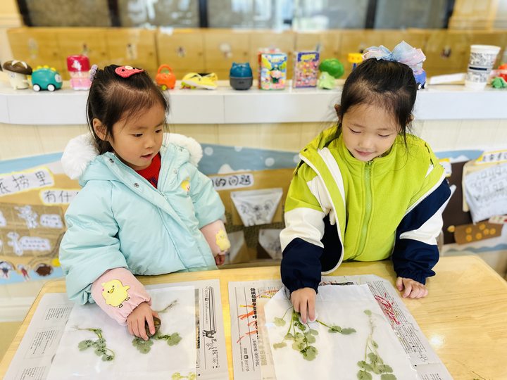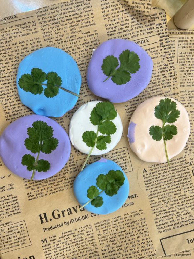 看,孩子们正模仿制作树叶标本的方法,将香菜制成标本。