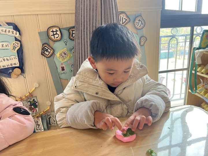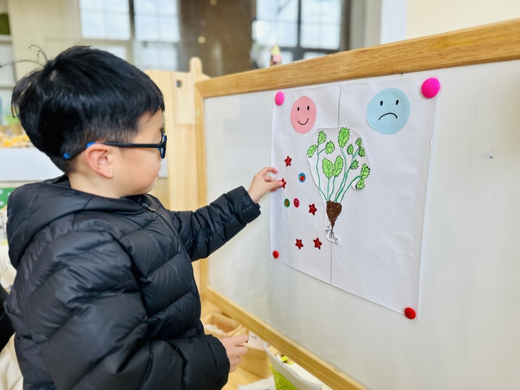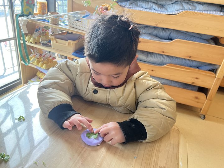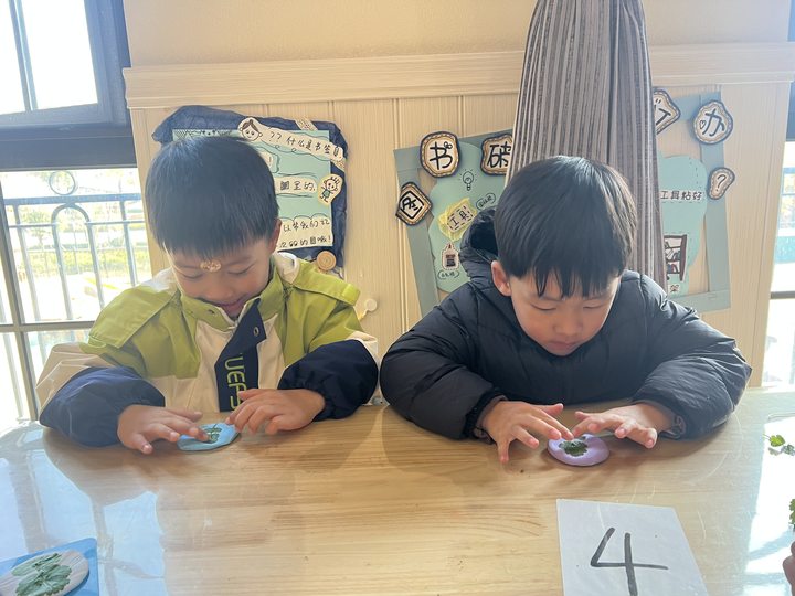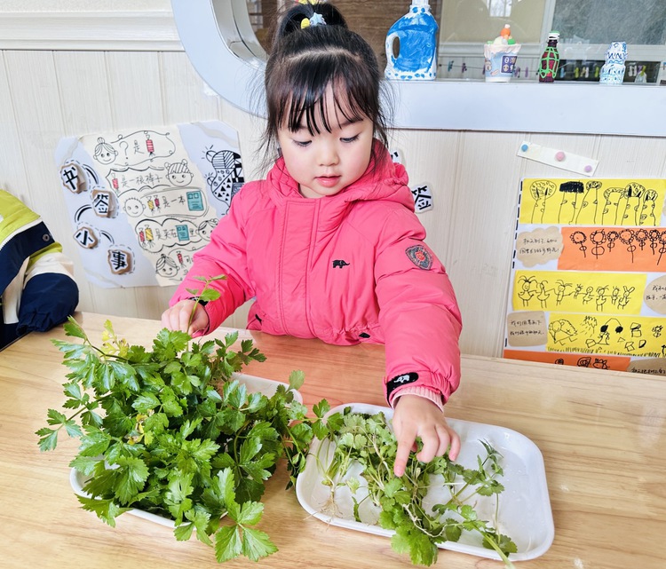孩子们将这两种长得很像的菜摆放在一起,仔细比较它们的不同。