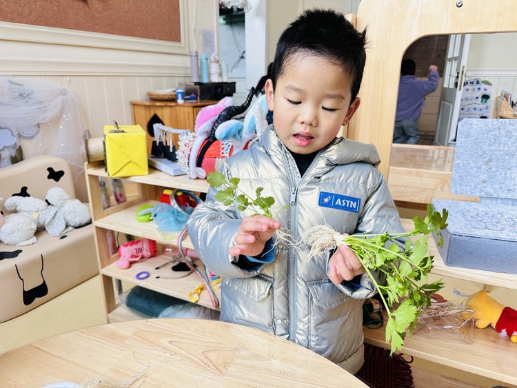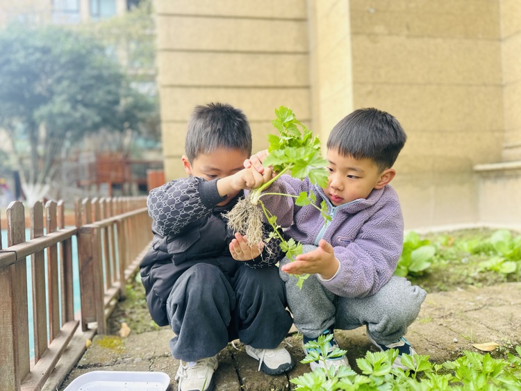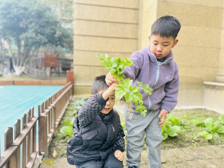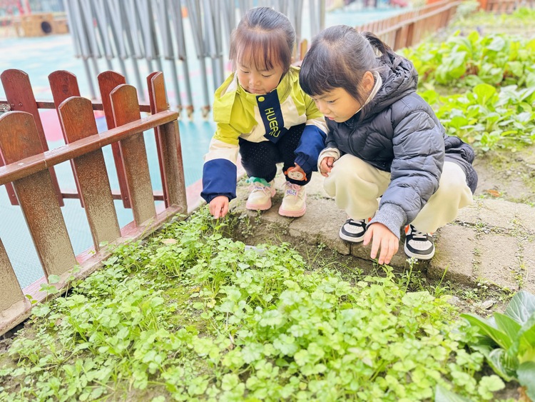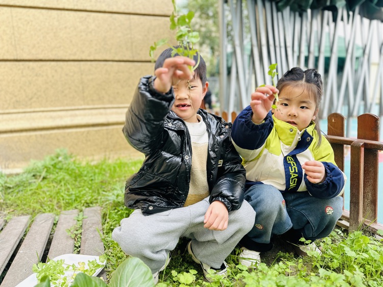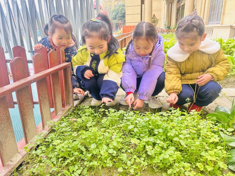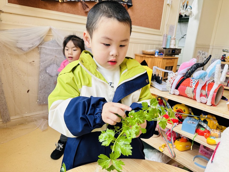 一个阳光明媚的午后,孩子们在园里散步时,欣喜地发现,我们种植的香菜成熟了。炯炯开心地大叫:“我们的香菜又长高了!”孩子们一起围过去观看。