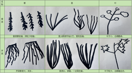 经过我们的探究,根须较少的、叶子圆圆的是香菜,根须较多、叶子尖尖的是芹菜。
