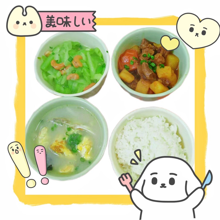 午餐:番茄土豆炖牛肉、腰果炒西芹、鱼头煎蛋萝卜丝汤、大米饭;