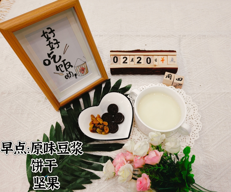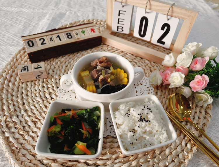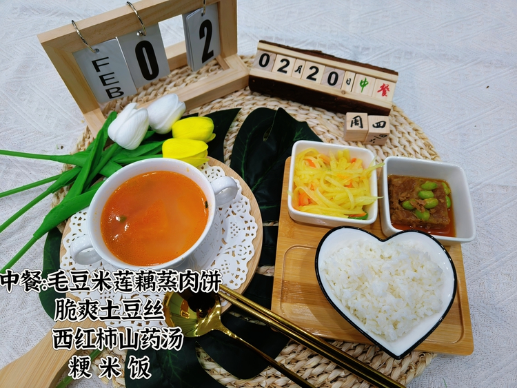 毛豆米莲藕蒸肉饼、脆爽土豆丝、西红柿山药汤、粳米饭