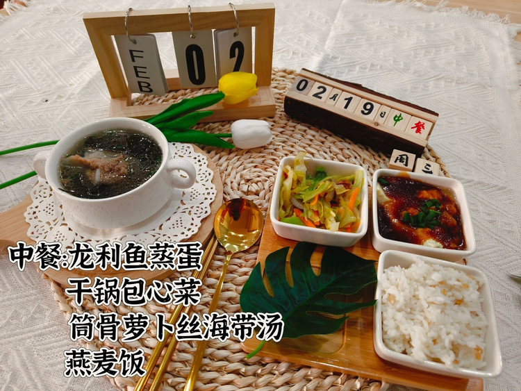龙利鱼蒸蛋、干锅包心菜、筒骨萝卜丝海带汤、燕麦饭