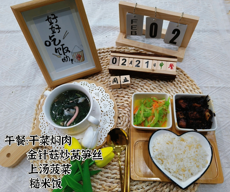 干菜焖肉、金针菇炒莴笋丝、上汤菠菜、糙米饭