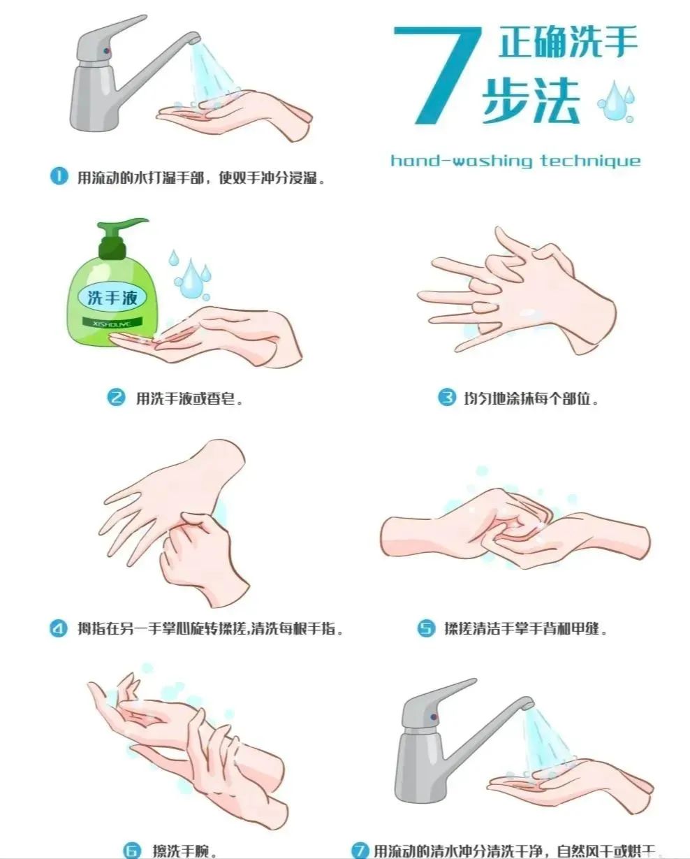 养成良好的个人卫生习惯,勤洗手,尤其在处理食物时、进食前及如厕后。坚持用肥皂或洗手液搓洗双手15~20秒,并用流动水冲洗干净。