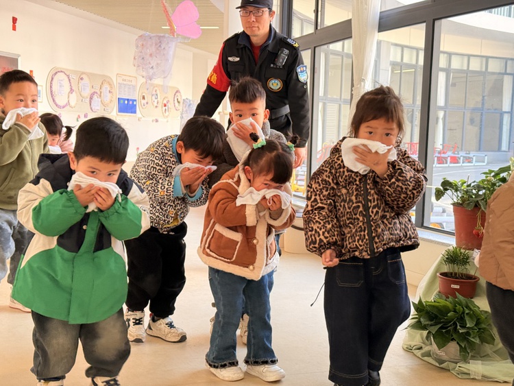 消防警报声响起,演练正式开始,小朋友们在老师的带领下迅速按照预案的疏散线路,用湿毛巾捂住口鼻,俯身弯腰前行,秩序井然地沿着指定路线有序撤离到安全地带。
