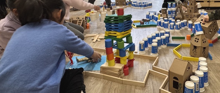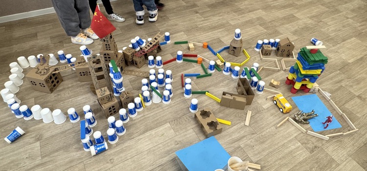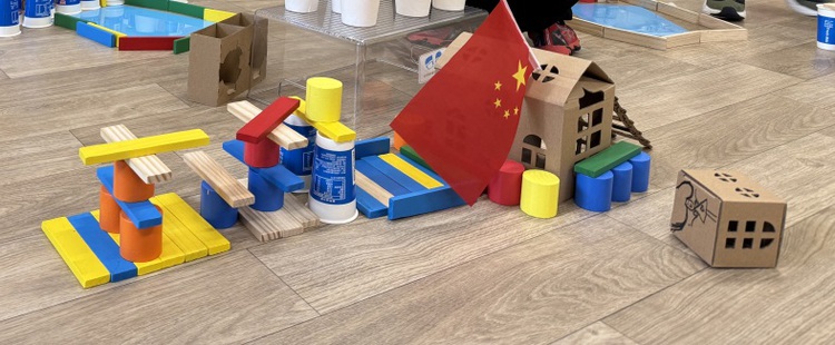 随着活动逐步深入,孩子们不再满足于简单的搭建,开始大胆尝试使用多种材料,构建出他们心中更完整的家乡。他们把生活里熟悉的元素,像车水马龙的马路、充满欢乐的幼儿园、温暖的家,还有那些标志性建筑,都融入到搭建作品中。