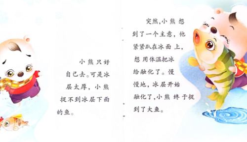 突然,小熊想到了一个主意,他紧紧趴在冰面上,想用体温把冰给融化了。慢慢地,冰层开始融化了,小熊终于捉到了大鱼。