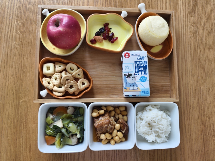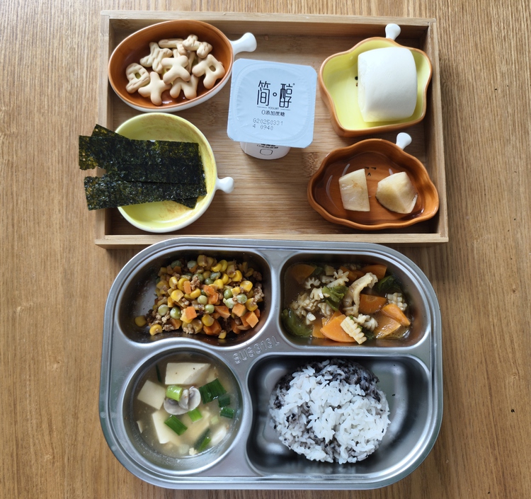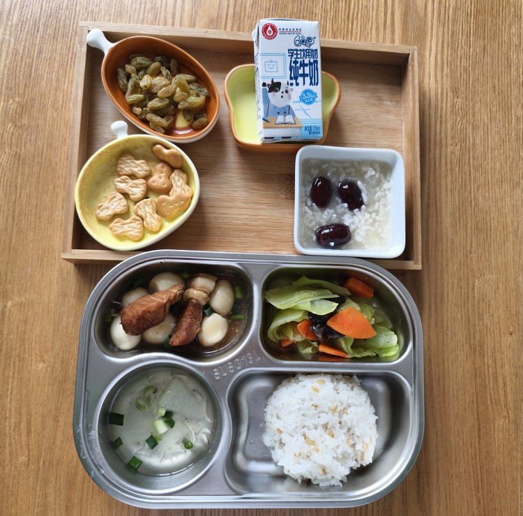 午餐:粳米饭 五香鸡翅 莴笋山药片 裙带菜豆腐鸡蛋汤