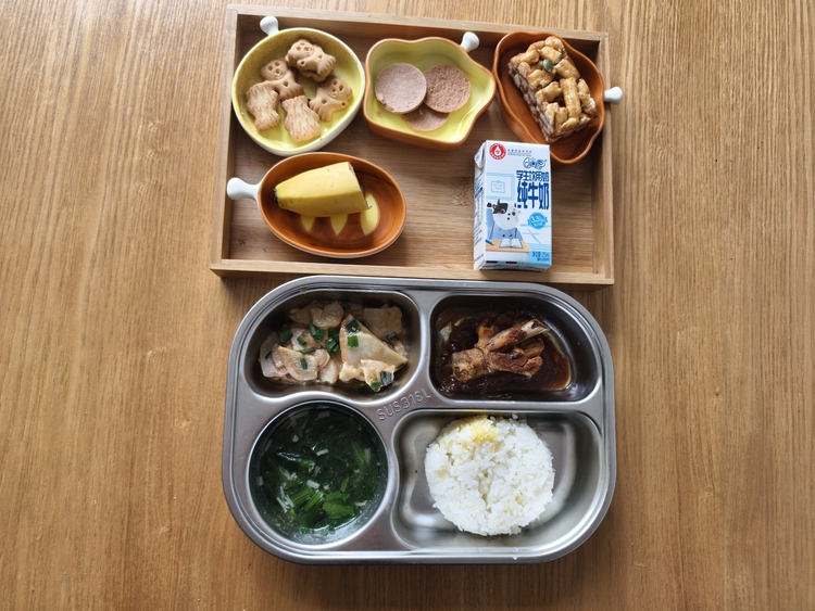 午餐:小米饭 红烧肉 上汤西兰花 虾皮豆腐汤