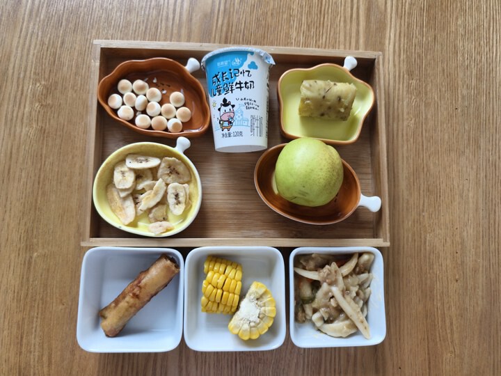 午餐:玉米饭 五彩牛肉丝 大白菜油豆腐 番茄菌菇汤