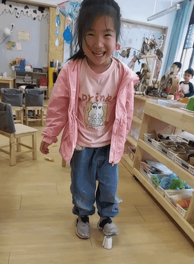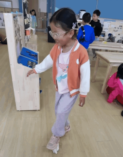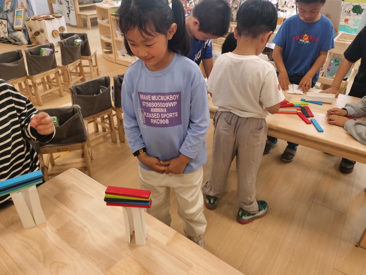 这个时候他们提出上面放一块板,这样就能撑住我们了。大家伙们开始纷纷尝试了起来,有的拿积木、有的拿绘本、有的拿地垫、有的拿垫板,让我们来看看他们的实验过程吧!