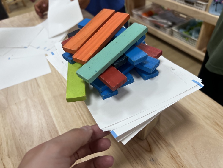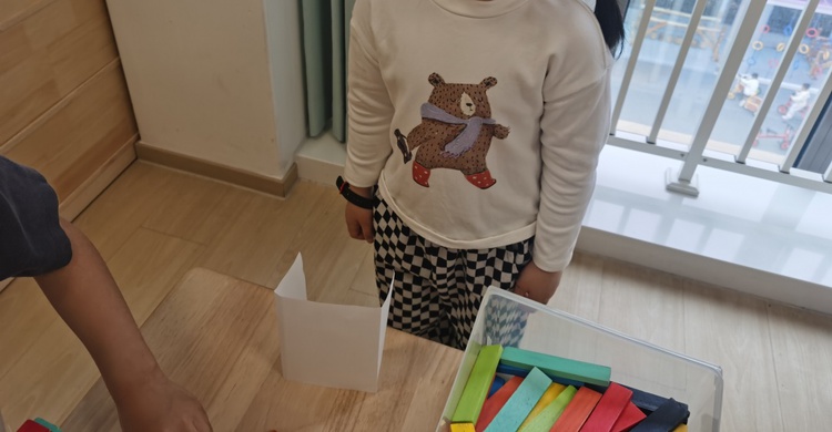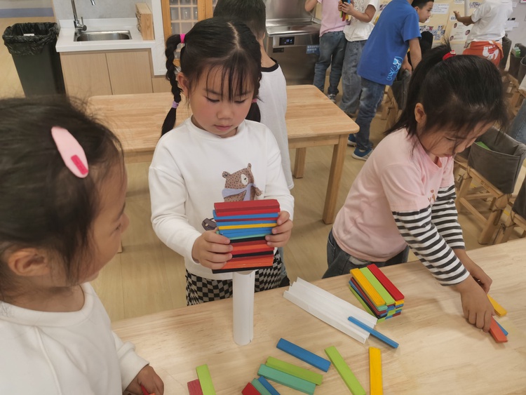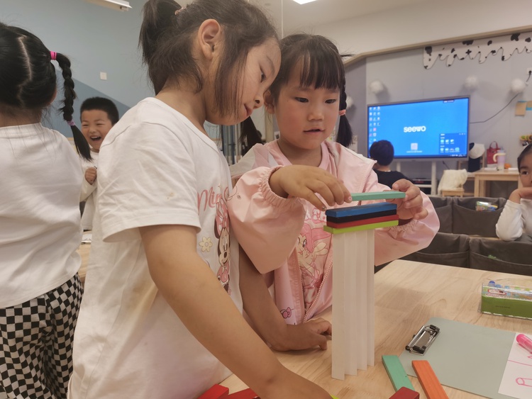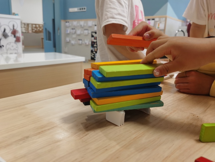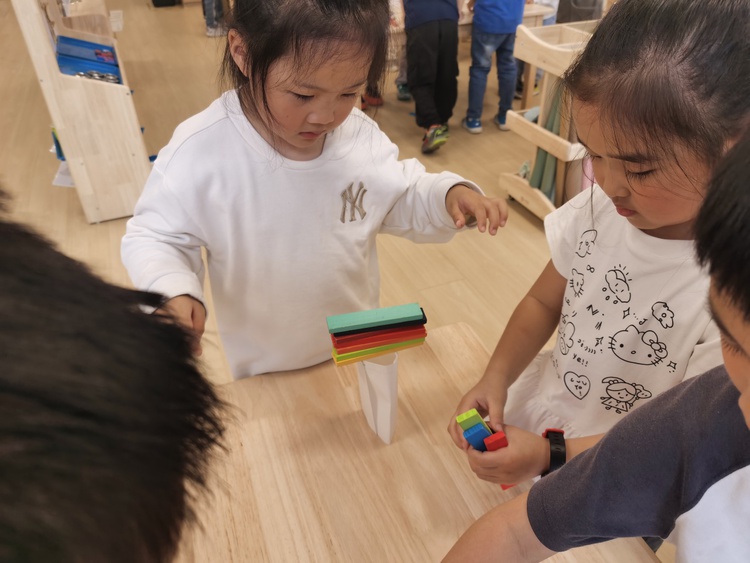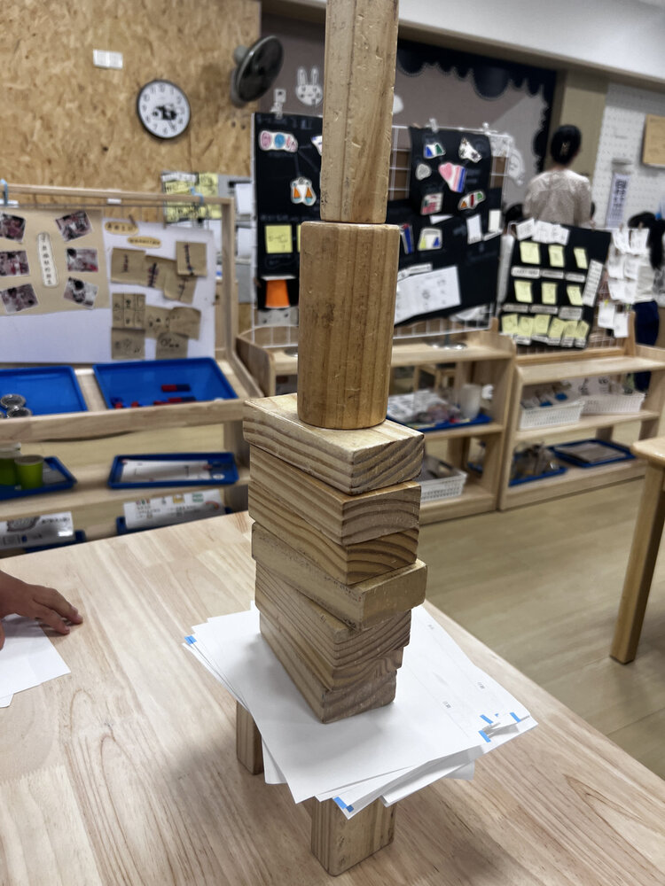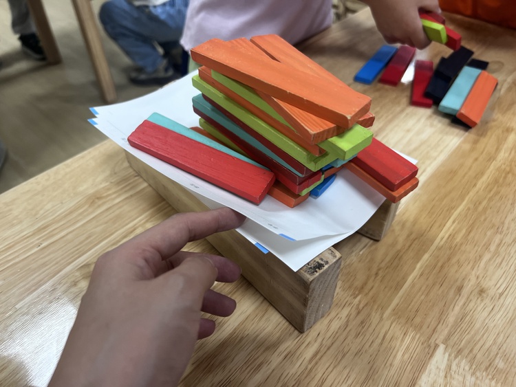 两个人的对话,引来了大家的注意,孩子们骤然好奇:一张纸还能举起积木?大家也想一探究竟。