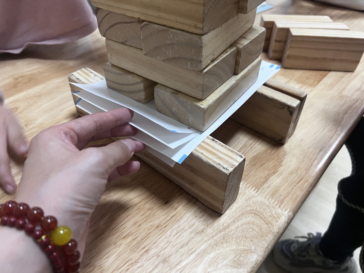 而云起的一个问题,并没有将活动戛然而止,他说:刚刚纸下面有“脚”支撑着,如果没有这两块积木,纸的力量还会有这么大吗?