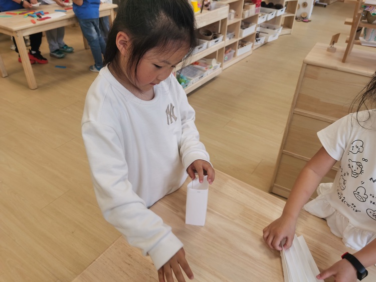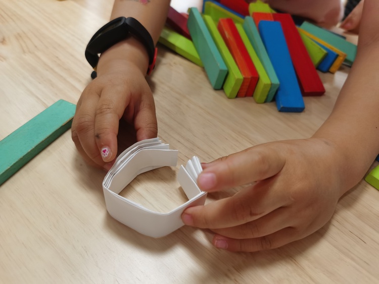 于是,我们再次开启了实验操作,有了之前搭建纸桥的经验,孩子们将纸进行折叠,然后放上积木,他们兴奋地喊道:看,没有积木,纸也能将东西举起来!