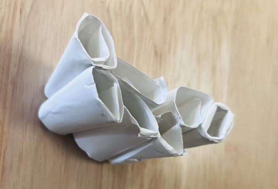 原来他们将纸折成了“波浪形”,折成三棱柱、扇形、圆柱等创新折法,让纸站了起来。
