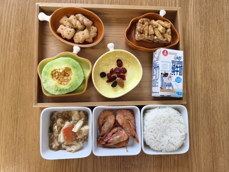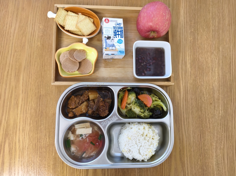 午餐:小米饭 红烧肉 上汤西兰花 虾皮豆腐汤