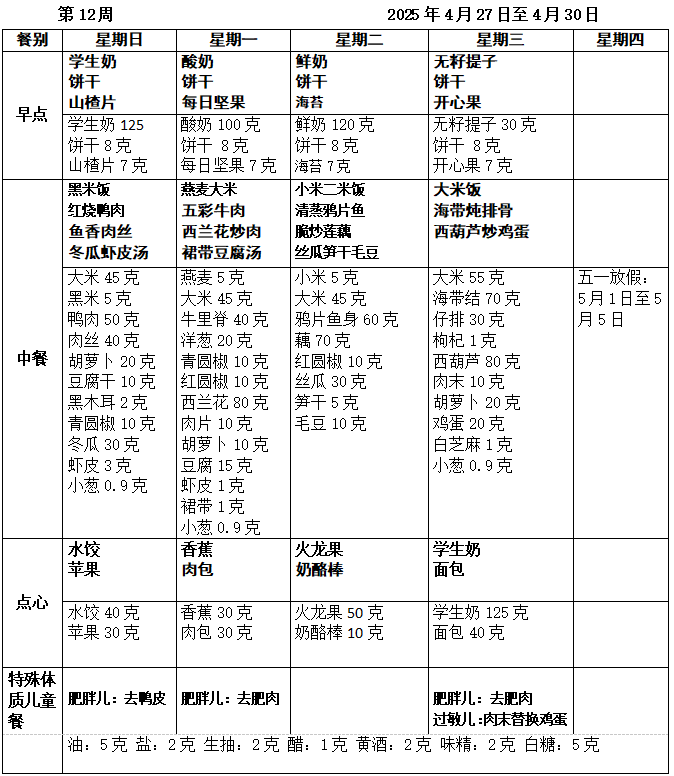 特殊餐:肥胖儿:去肥肉 ,过敏儿:肉末替换鸡蛋