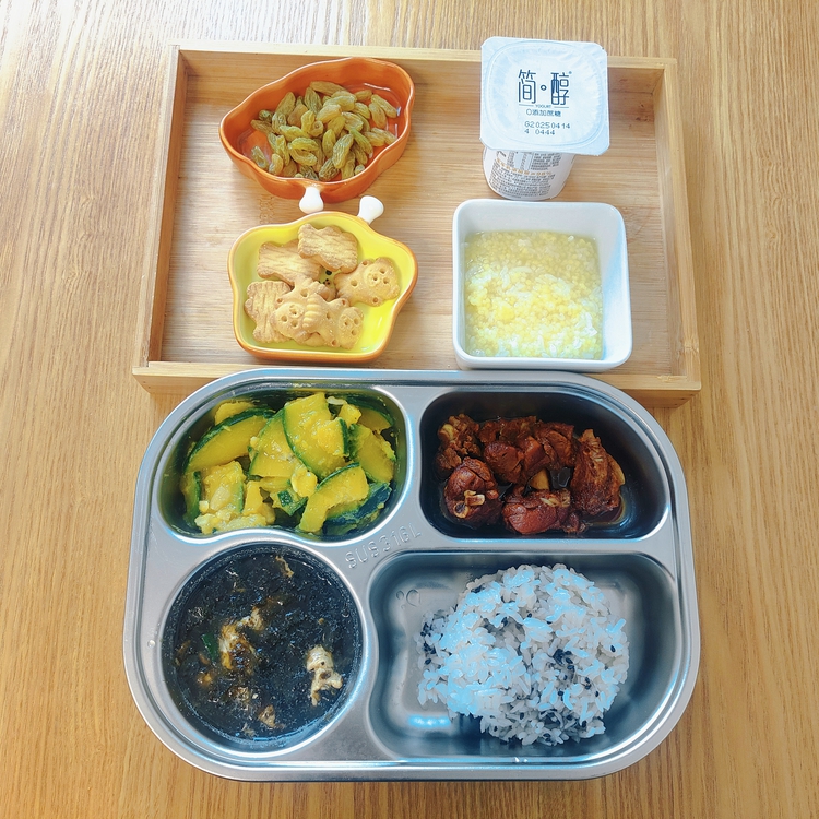 午餐:芝麻饭 红烧鸭块 蒜香南瓜 紫菜蛋花汤