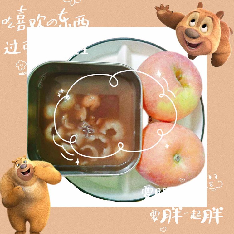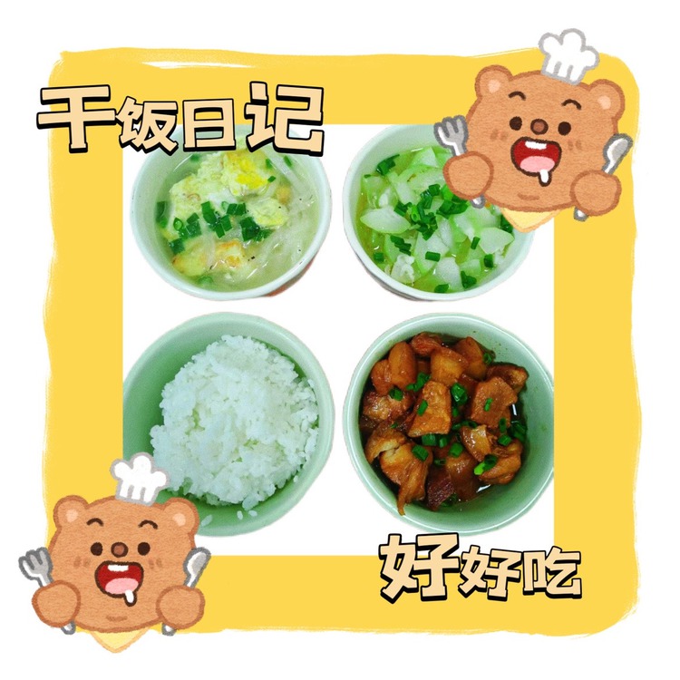 午餐:红烧肉、虾皮炒葫芦、鱼头煎蛋萝卜丝汤、大米饭;
